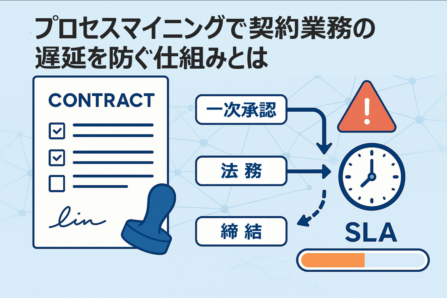 プロセスマイニング 契約処理は、見えない"待ち"を露わにし、最短バリアントの標準化と自動エスカレーションで遅延を未然に防ぎます。