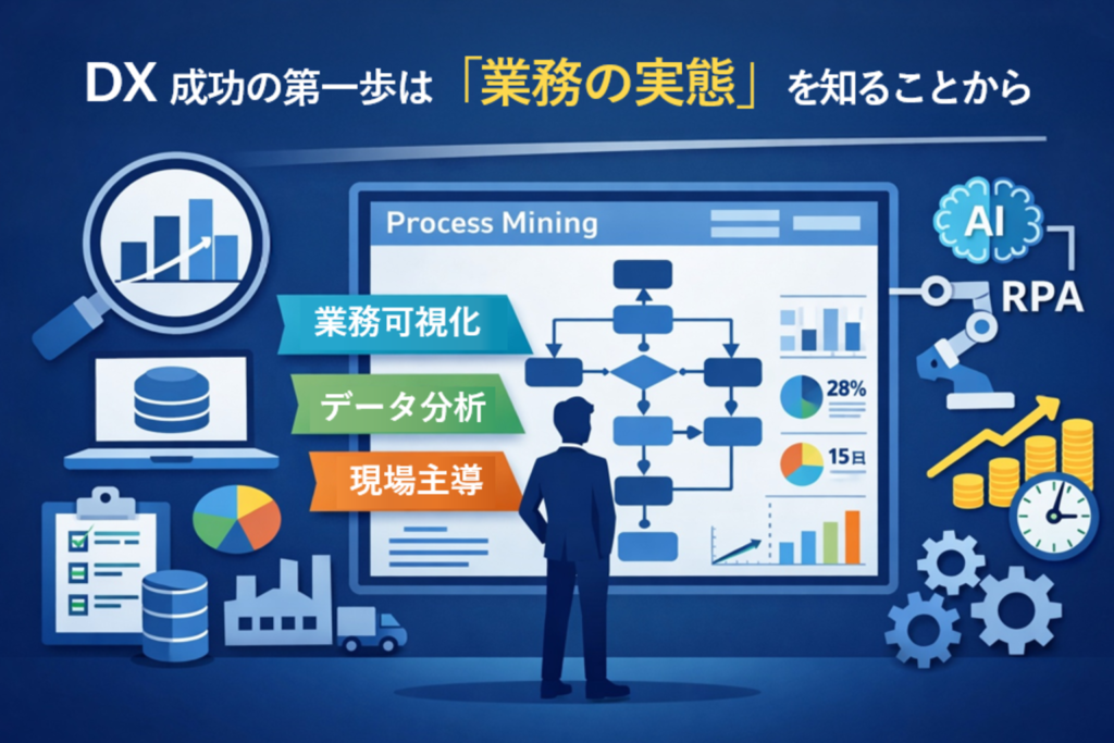 DXの成功は、理想像を描くことではなく、現実を直視することから始まります。プロセスマイニングは、業務可視化を通じて現場主導の変革を実現するための強力な基盤です。